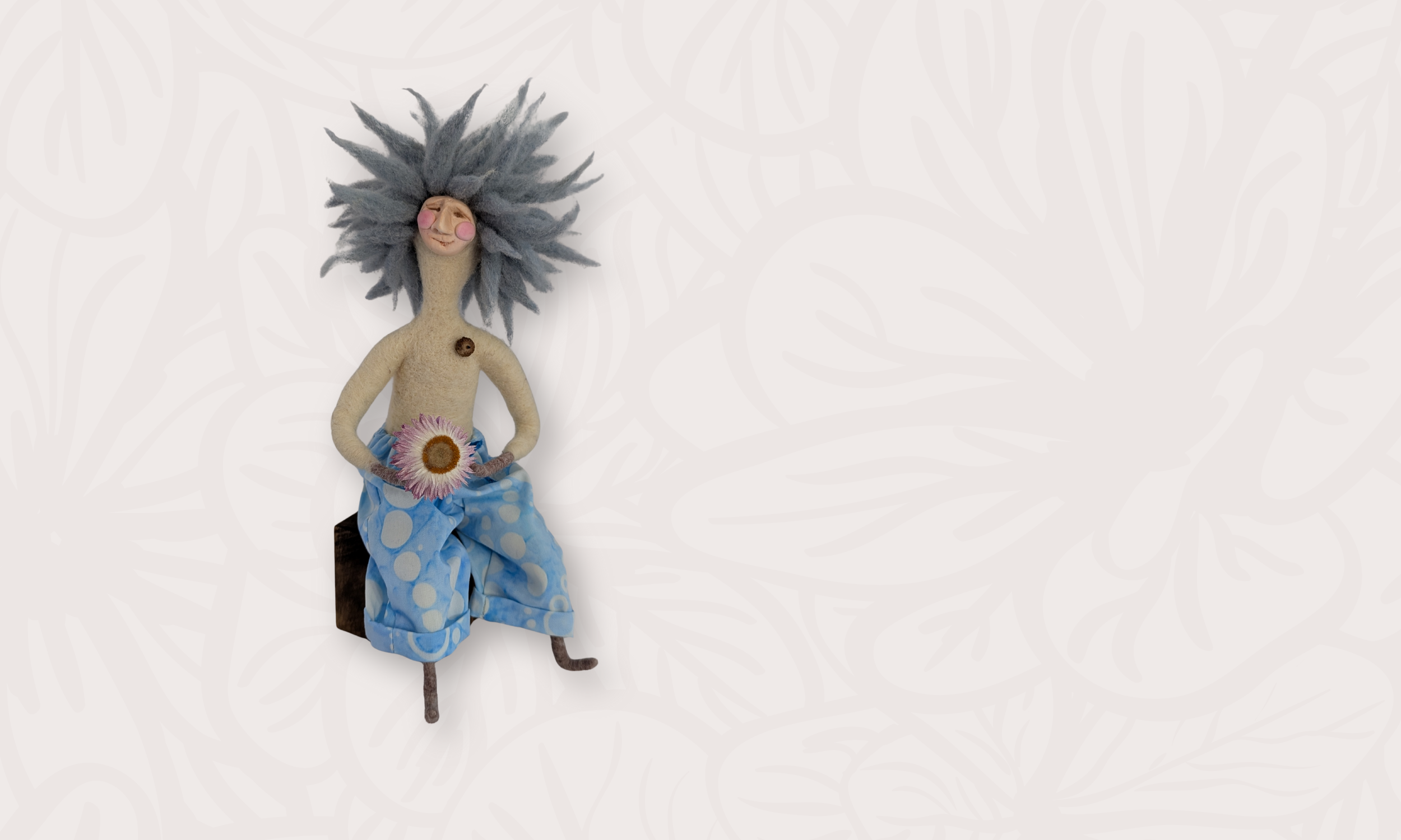 This little Guardian is needle-felted, with baby-blue wool hair and hand-sewn swim trunks. He holds a dried flower from my garden and can sit either on his wood block or on his own, ready to keep you company wherever he lands.